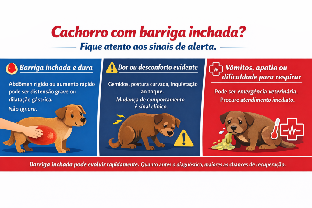 Quando o cachorro apresenta barriga inchada e dura, dor intensa, vômitos repetidos, dificuldade para respirar, apatia extrema ou colapso, o atendimento deve ser imediato.